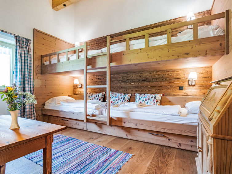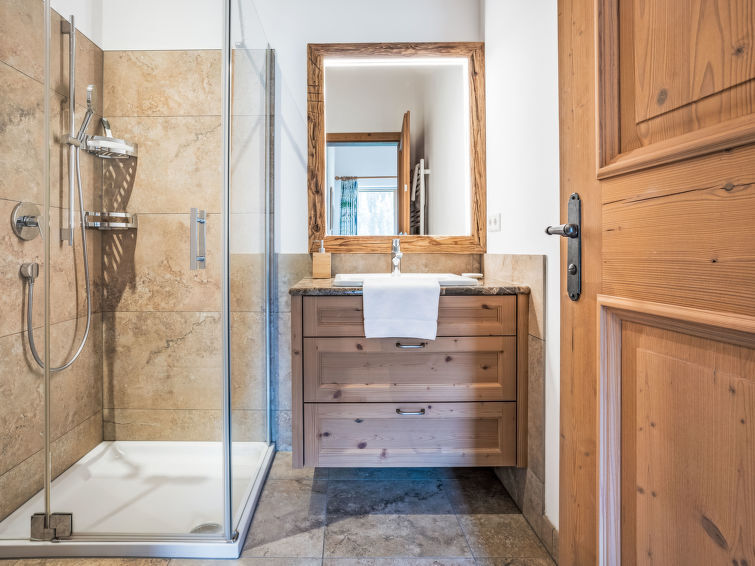 "Orleans 1", 5-Zimmer-Wohnung 147 m2 im 1. Stock. Geräumig und hell, sehr komfortabel und geschmackvoll eingerichtet: Eingang. Unteres Geschoss: Dusche, sep. WC, Sauna. Obergeschoss: offenes grosses Wohn-/Esszimmer mit Schwedenofen, Essecke, Sat-TV, Internationale TV-Sender und Flachbildschirm. Ausgang zum Balkon. 2 Doppelzimmer, jedes Zimmer mit Dusche/WC. Ausgang zum Balkon. 1 Doppelzimmer mit Bad/Dusche/WC. Ausgang zum Balkon. 1 Zimmer mit 2 x 2 Etagenbetten. Grosse Wohnküche (Backofen, Geschirrspüler, 4 Glaskeramikplatten, Toaster, Wasserkocher, Mikrowelle, Tiefkühler, elektrische Kaffeemaschine). Parkettboden, Natursteinboden. Komfortable Einrichtung im Landhausstil. Grosser Balkon. Balkonmöbel. Sehr schöne Panoramasicht auf die Berge und die Landschaft. Zur Verfügung: Bügeleisen, Kinderhochstuhl, Babybett bis 2 Jahre, Haartrockner. Internet (Wireless LAN, gratis). Bitte beachten: Nichtraucher-Haus. Rauchmelder, Feuerlöscher. Bei den Doppelbetten handelt es sich um "King Size Betten". 50612-000971-2020