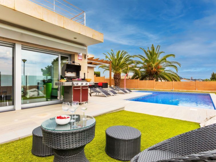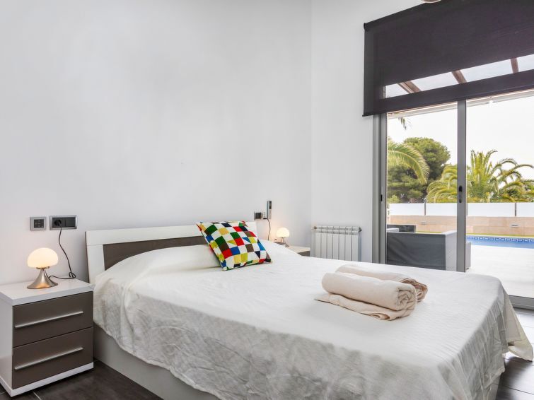 "Chill", villa 5-kamers 250 m2. Ruim en licht, zeer comfortabel en modern ingericht: woon-/eetkamer met eettafel, Digitale TV, air-conditioning en heteluchtverwarming. Uitgang naar het terras, naar het zwembad. 1 2-pers. kamer met 2 bedden (90 cm, lengte 190 cm), Digitale TV. 2 2-pers. kamers, elke kamer heeft 1 2-pers bed (160 cm, lengte 190 cm), douche/WC. 1 groot 2-pers. kamer met 1 2-pers bed (160 cm, lengte 190 cm), bad/bidet/WC en Digitale TV. Uitgang naar het terras, naar het zwembad. Groot, open keuken (oven, afwasmachine, 4 keramische glas kookplaten, broodrooster, waterkoker, magnetron, diepvriezer, elektrische koffiemachine) met bar. Douche/WC. Terrasmeubelen, ligstoelen. Uitzicht in de verte op zee en de plaats. Ter beschikking: wasmachine, droger, strijkijzer, kinderstoel, kinderbed tot 2 jaar, haardroger. Internet (WiFi, gratis). Geschikt voor families. TV alleen ES. HUTG-024555 // Reg. Nr.: ESFCTU00001702100009519300000000000000000HUTG-0245550